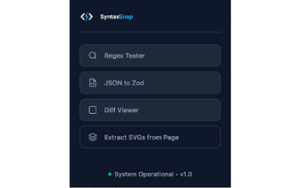 SyntaxSnap é uma extensão para o Chrome que oferece um conjunto robusto de ferramentas para desenvolvedores, priorizando a privacidade e a eficiência. Com recursos como conversores de GraphQL, TypeScript e OpenAPI para Zod, além de um testador de Regex e um extrator de SVG, SyntaxSnap integra utilidades essenciais diretamente no fluxo de trabalho do navegador. A extensão foi projetada para eliminar a necessidade de alternar entre várias abas e simplificar tarefas comuns de desenvolvimento.
